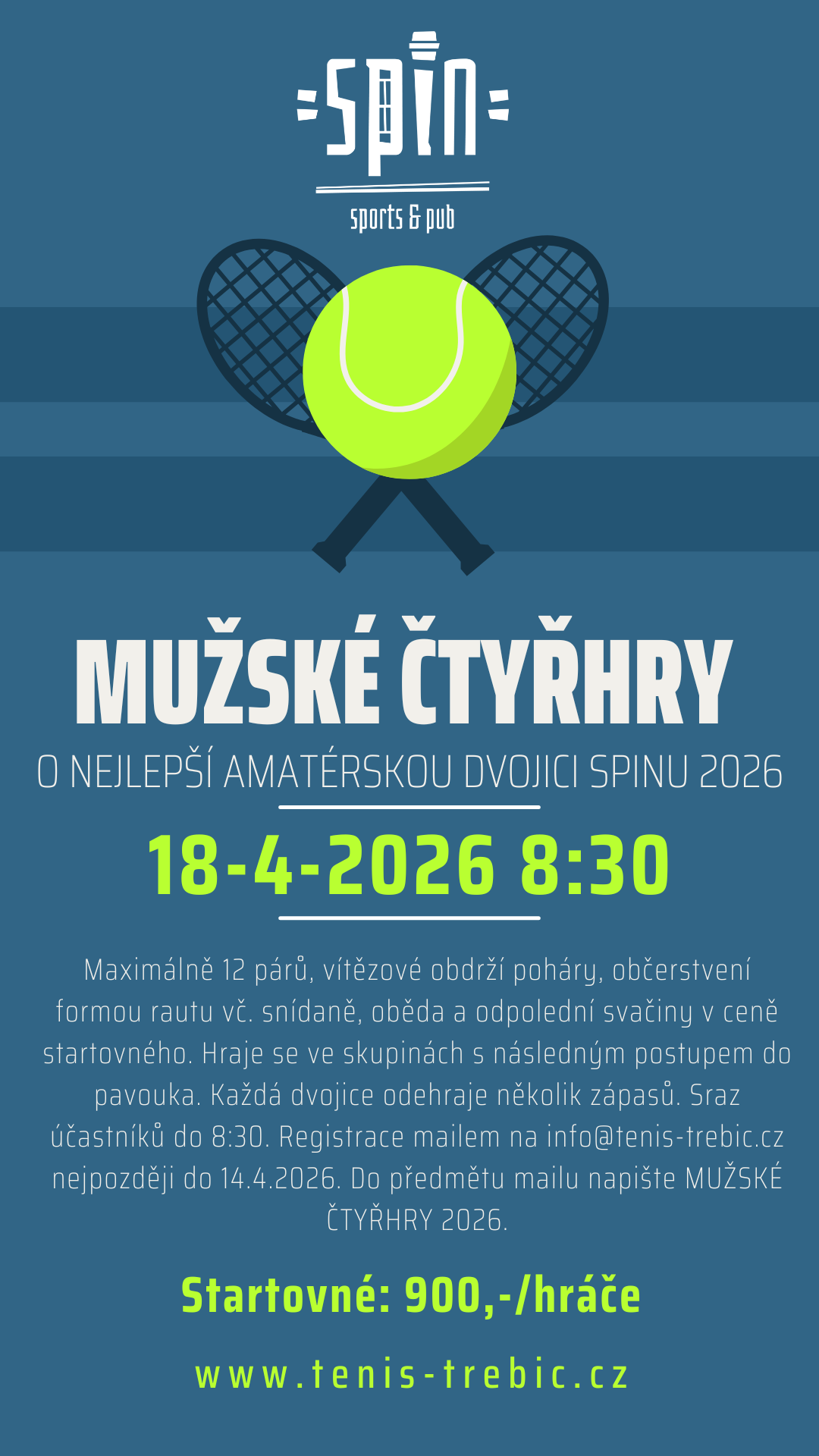Registrace mailem na info@tenis-trebic.cz nejpozději do 14.4.2026. Do předmětu mailu napište MUŽSKÉ ČTYŘHRY 2026.